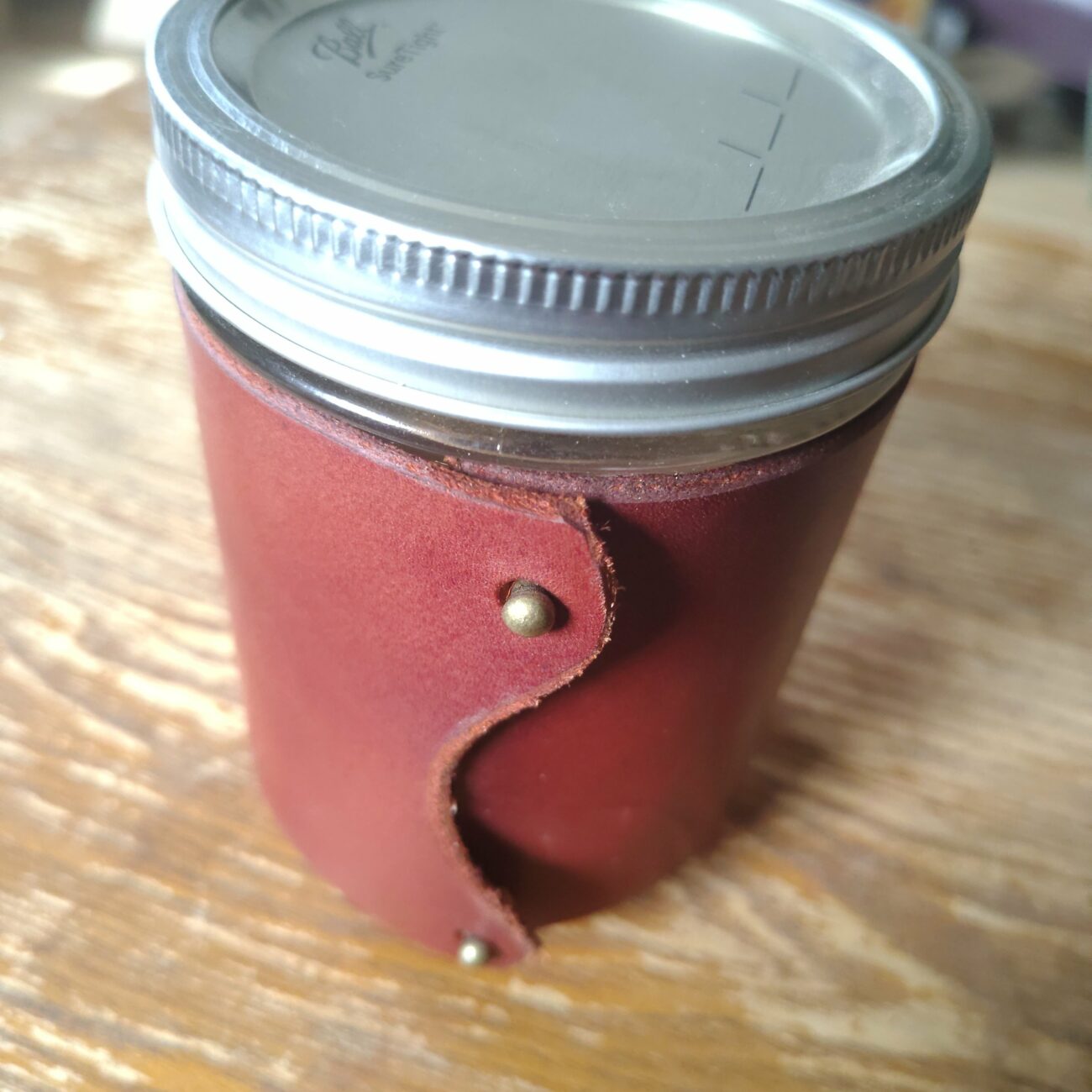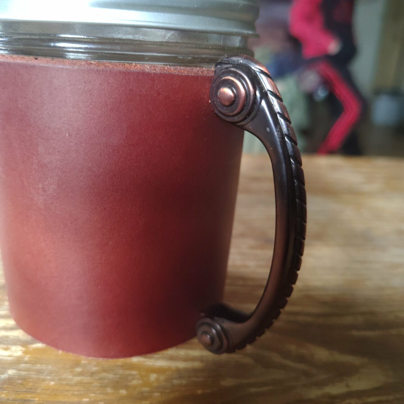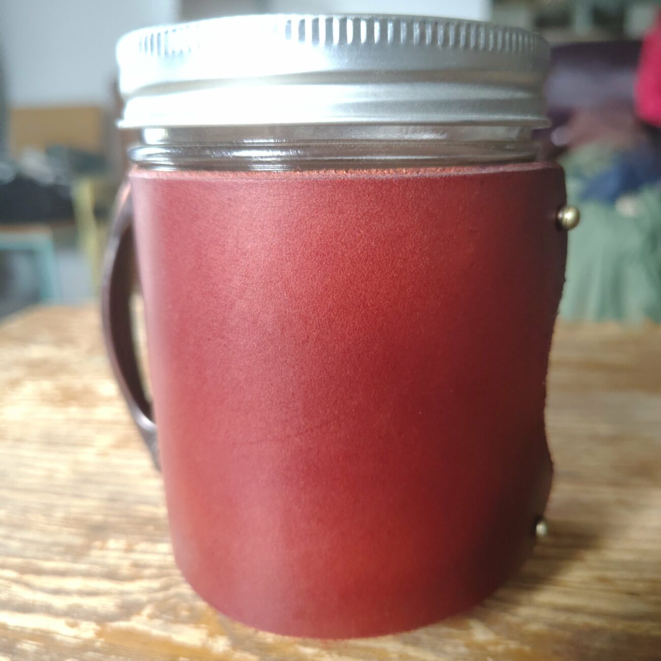 Convert a timeless 16 oz. wild-mouth Ball jar into a stylish, sealable mug. Perfect for on the go. Use for coffee, tea, or even soup. I mean…its a canning jar. Made from hand crafted leather, this particular leather jar cover comes in various colors with an innovative metal handle. More colors to come!