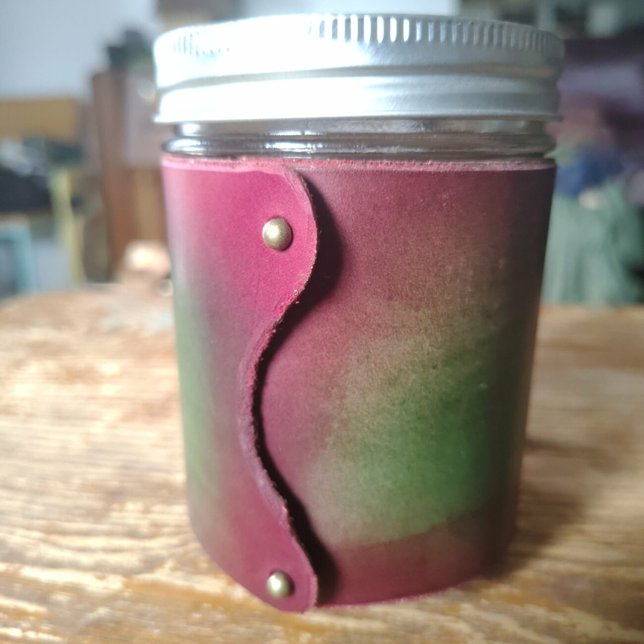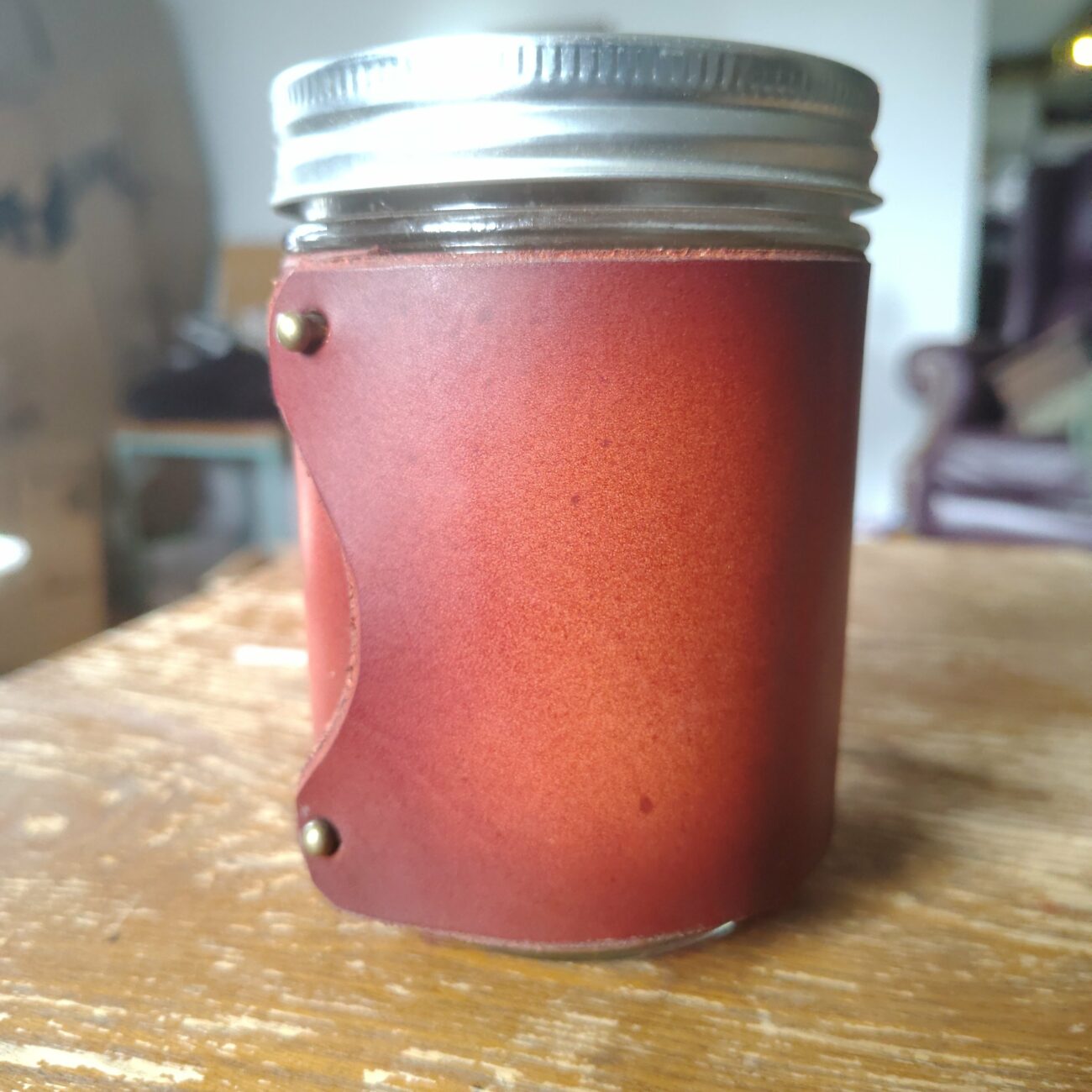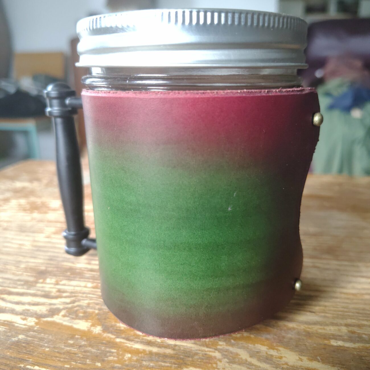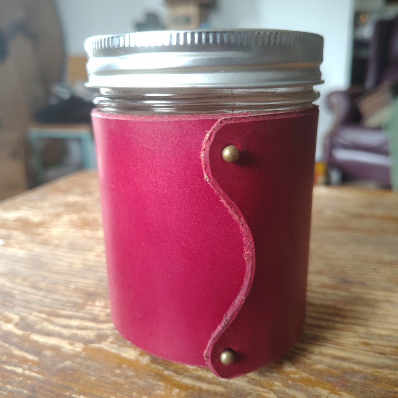 Convert a timeless 16 oz. wild-mouth Ball jar into a stylish, sealable mug. Perfect for on the go. Use for coffee, tea, or even soup. I mean…its a canning jar. Made from hand crafted leather, this particular leather jar cover comes in various colors with an innovative metal handle. More colors to come!